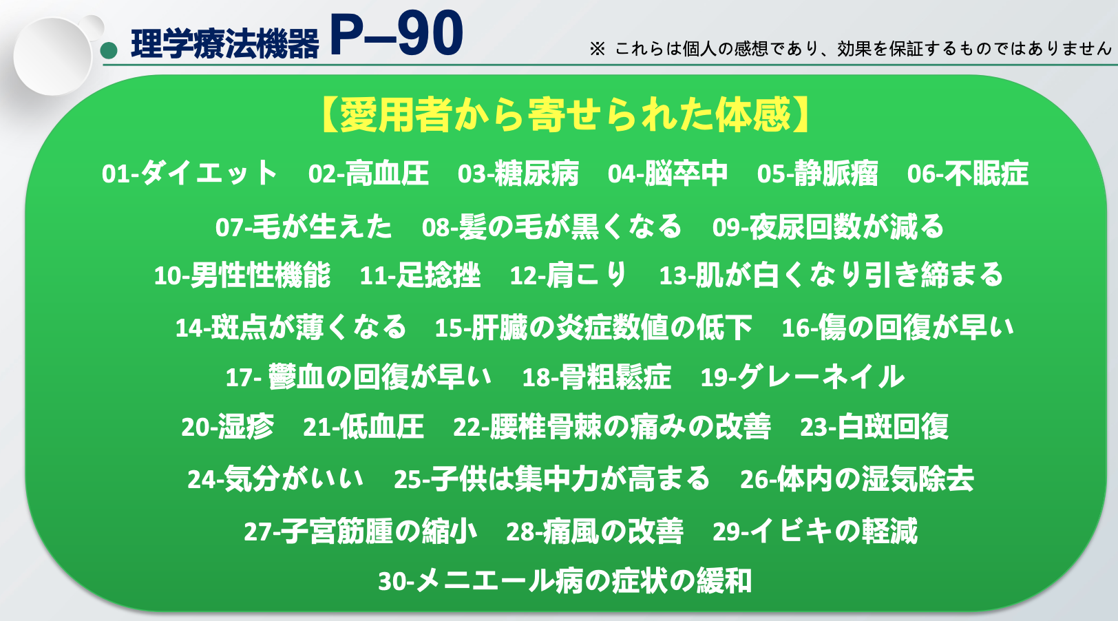 一言付け加えるなら、P90は特定の疾患を治すのではなく、人が本来持っている機能を正常な状態に近づけてくれる機器だということです。